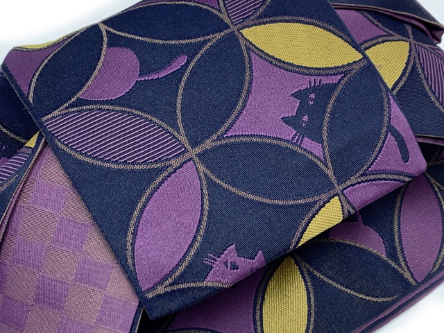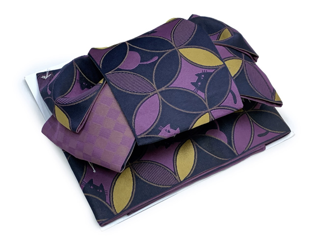 ホーム | 帯 > 作り帯、つけ帯半幅帯 作り帯 リボン返し結び帯 合繊【紫系、七宝に猫】