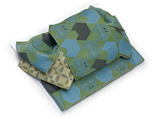 ホーム | 帯 > 作り帯、つけ帯半幅帯 作り帯 リボン返し結び帯 合繊【緑系、六角猫】