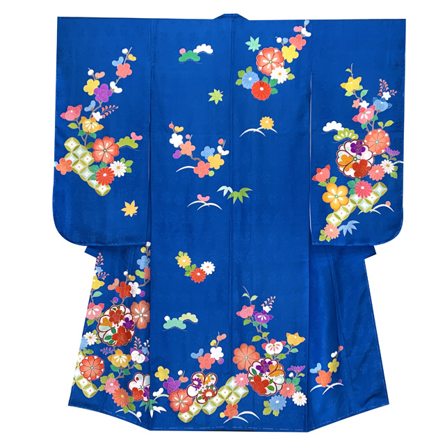 七五三 着物 正絹 フルセット 7歳 女の子 手描 盛金加工 金駒刺繍 古典柄 絵羽付け着物と結び帯セット【群青、松竹梅】[IYS997f21693KAZ]