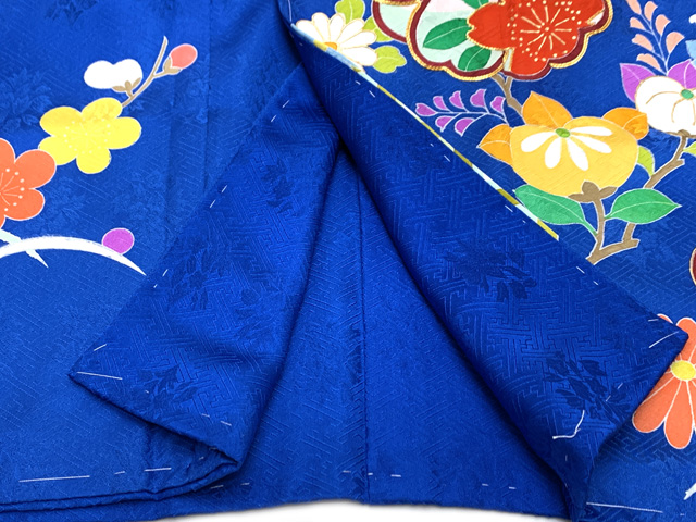 着物は手描きで柄が描かれており、裾前の柄の一部には盛金加工や金駒刺繍が施されています。