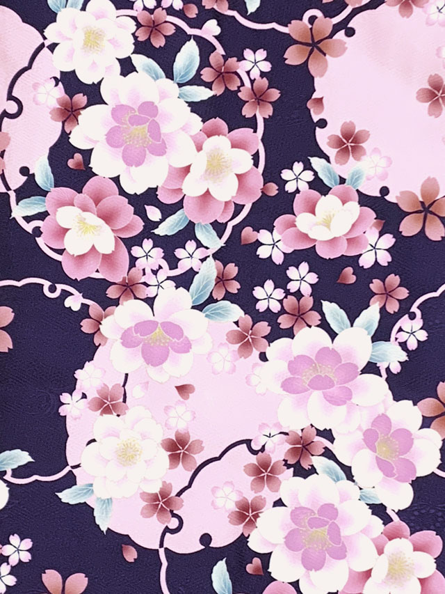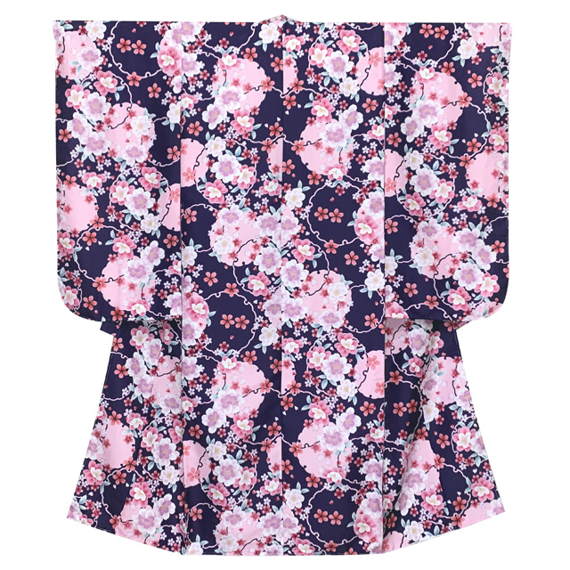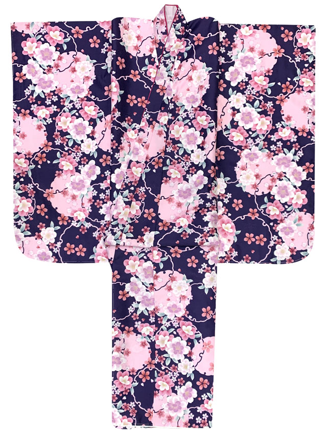 七五三 着物 7歳 女の子用 四つ身の着物と結び帯 他 コーディネート フルセット【茄子紺色、雪輪と八重桜】[OYM-A802f21693PP]