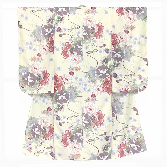 ホーム | 七五三 着物(女の子用) > 七五三 7歳 着物フルセット七五三 着物 女の子 フルセット 総柄の女の子用 子供着物 結び帯コーデセット(合繊)【クリーム、ピンク牡丹】