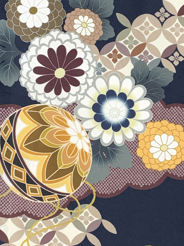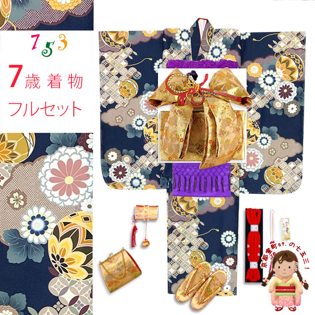 ホーム | 七五三 着物(女の子用) > 七五三 7歳 着物フルセット七五三 着物 女の子 フルセット 総柄の女の子用 子供着物 結び帯コーデセット(合繊)【紺地、雲どりに鞠・菊】