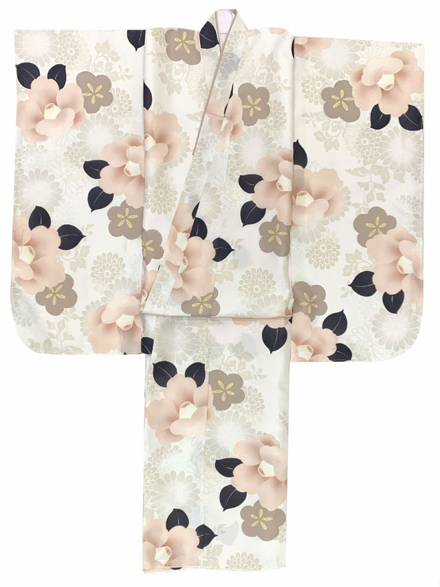 ホーム | 七五三 着物(女の子用) > 七五三 7歳 着物フルセット七五三 着物 女の子 フルセット 総柄の女の子用 子供着物 結び帯コーデセット(合繊)【生成り系、ピンク椿・薄茶菊】