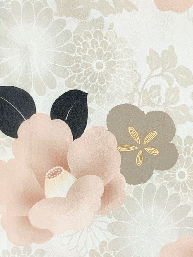七五三 着物 女の子 フルセット 総柄の女の子用 子供着物 結び帯コーデセット(合繊)【生成り系、ピンク椿・薄茶菊】[T7K-2552d106RR]