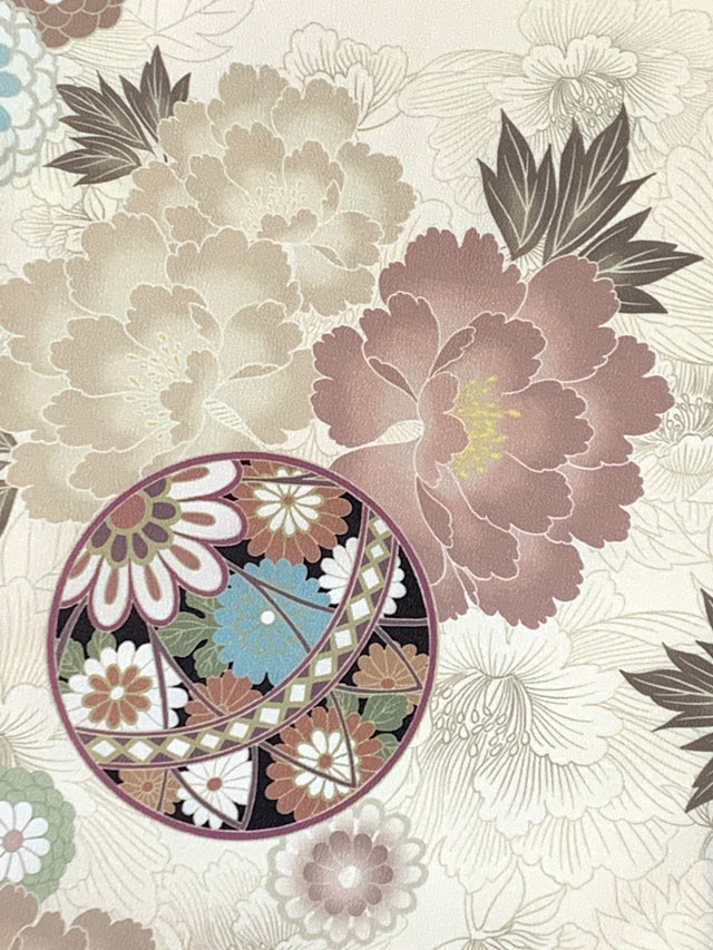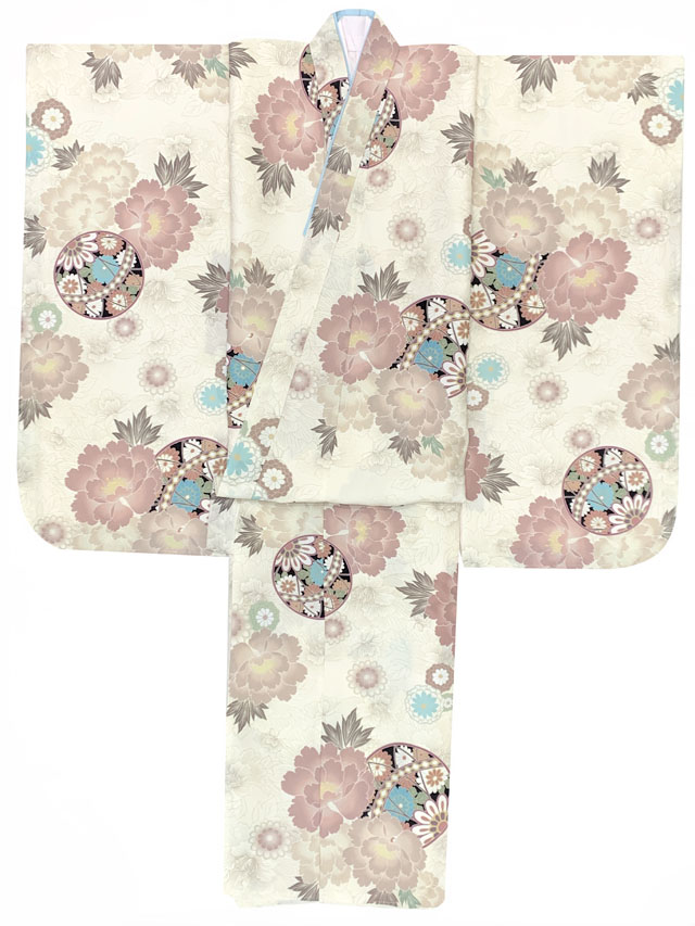 七五三 7歳 女の子用 小紋柄 四つ身の着物と結び帯 他 フルセット【クリーム系、古典柄 鞠と牡丹】[T7K-2555i32741KZZ]