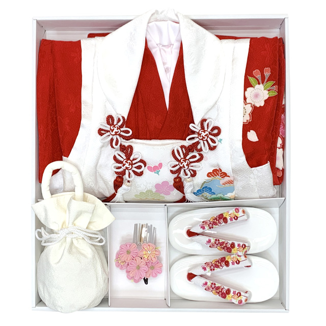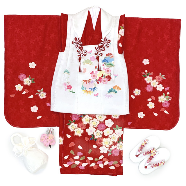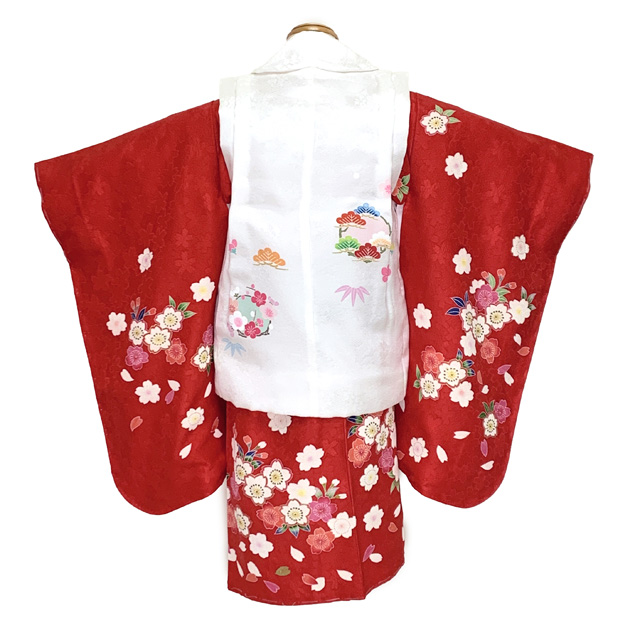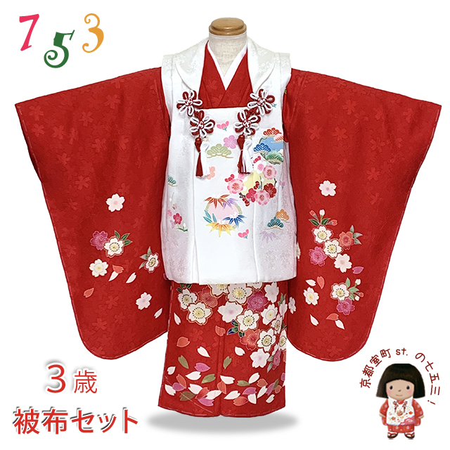 七五三 着物 3歳 正絹 フルセット 女の子 友禅 絵羽柄の着物 被布セット【紅白、松竹梅と桜】[OK3K2387-i902set]