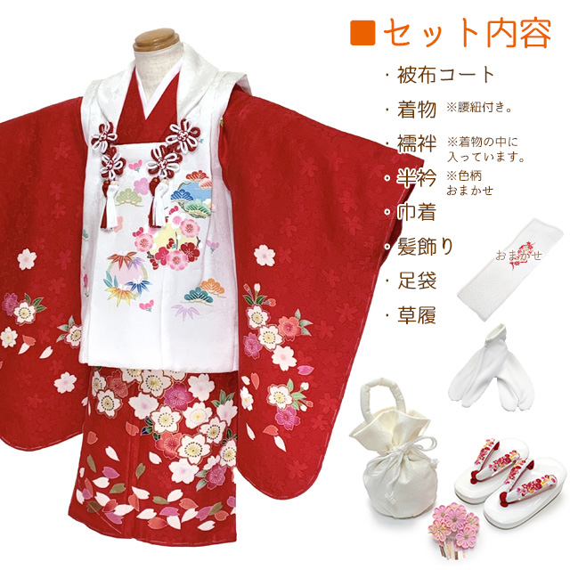 ホーム | 七五三 着物(女の子用) > 七五三 3歳 女の子 着物セット(被布セット)七五三 着物 3歳 正絹 フルセット 女の子 友禅 絵羽柄の着物 被布セット【紅白、松竹梅と桜】