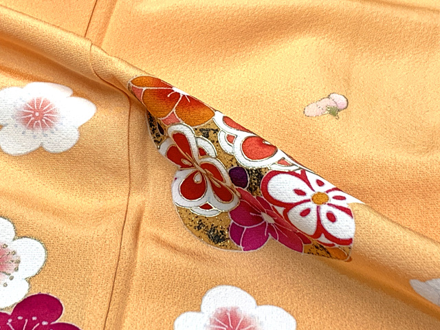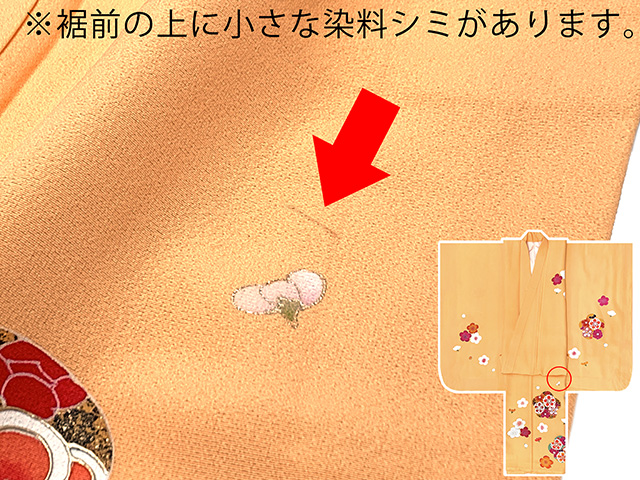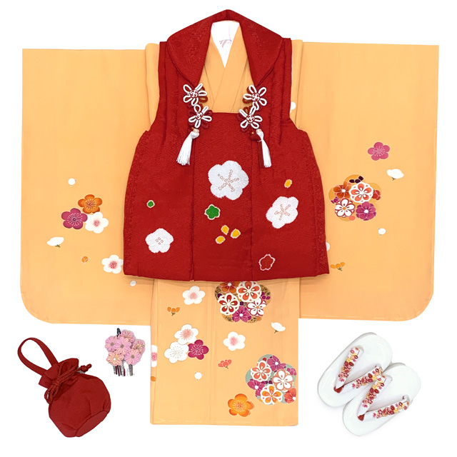 ホーム | 七五三 着物(女の子用) > 七五三 3歳 女の子 着物セット(被布セット)【ちょっと訳あり品】七五三 着物 3歳 正絹 フルセット 女の子 友禅 絵羽柄の着物 被布セット【赤x黄色、梅】