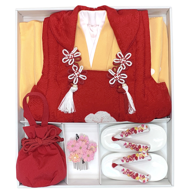 【ちょっと訳あり品】七五三 着物 3歳 正絹 フルセット 女の子 友禅 絵羽柄の着物 被布セット【赤x黄色、梅】[OK3K2389-t893set]
