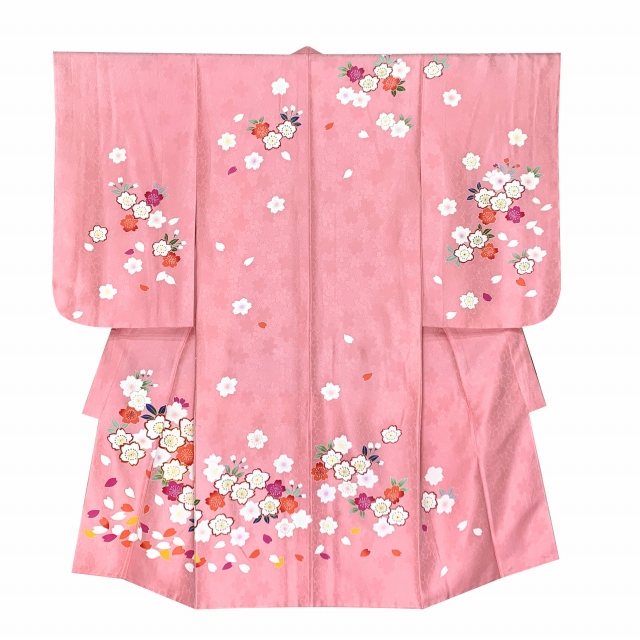 ホーム | 七五三 着物(女の子用) > 七五三 3歳 着物セット(結び帯セット)七五三 着物 3歳 女の子 フルセット 正絹 友禅柄 三つ身の絵羽着物 小寸結び帯・小物セット【ピンク、桜】