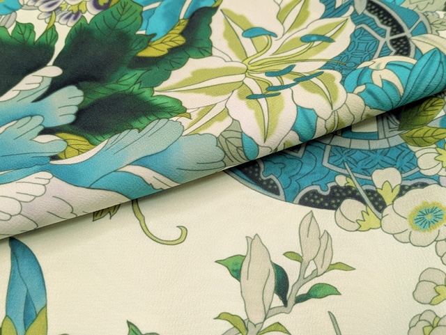 ホーム | ジュニア着物(十三参り、ジュニア小紋) > 十三参りに ジュニア振袖(単品)ジュニアサイズ 振袖 小紋柄 150サイズ 合繊 お正月 卒業式袴に【生成りx青緑系、花車】