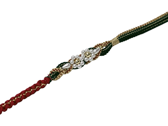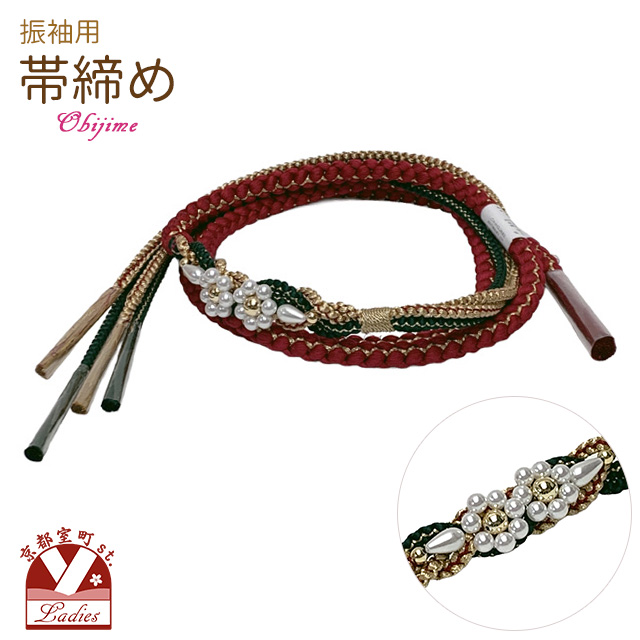 帯締め 振袖用 手組 パールビーズ飾り帯〆(正絹) 成人式 十三参りに【赤x緑】[FOJ588]