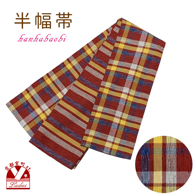 半幅帯 着物や浴衣に 半巾帯(細帯) 小袋帯 ポリ綿 約400cm【赤系チェック】[HOB1012]