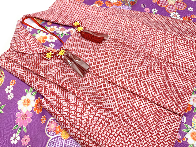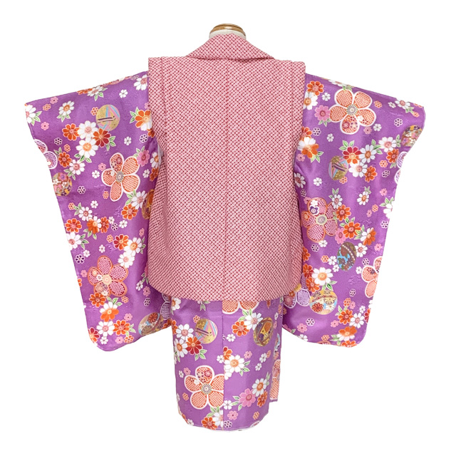七五三 着物 3歳 女の子 フルセット 古典柄の着物 鹿の子柄の被布コートセット【赤鹿の子x紫古典柄】[THFMab-rset-01]