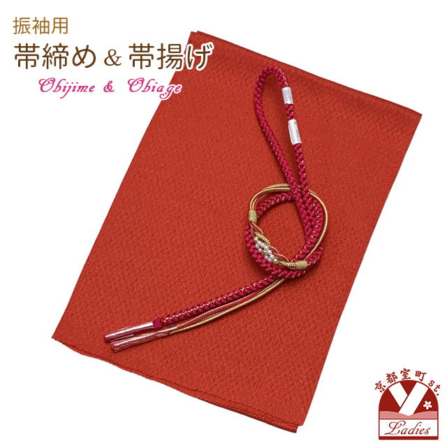 振袖用 帯揚げ 帯締め ポリエステルふくれ生地の帯揚げ パールビーズ飾りの振袖用帯〆 セット【レッド系】[FOBset-712oj572]