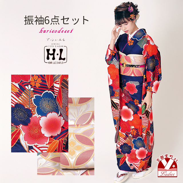 振袖 セット 成人式 正月 H・Lブランド 絵羽柄の振袖 袋帯 小物 6点セット【紺系、桜】[HLfuriset-b-14br]