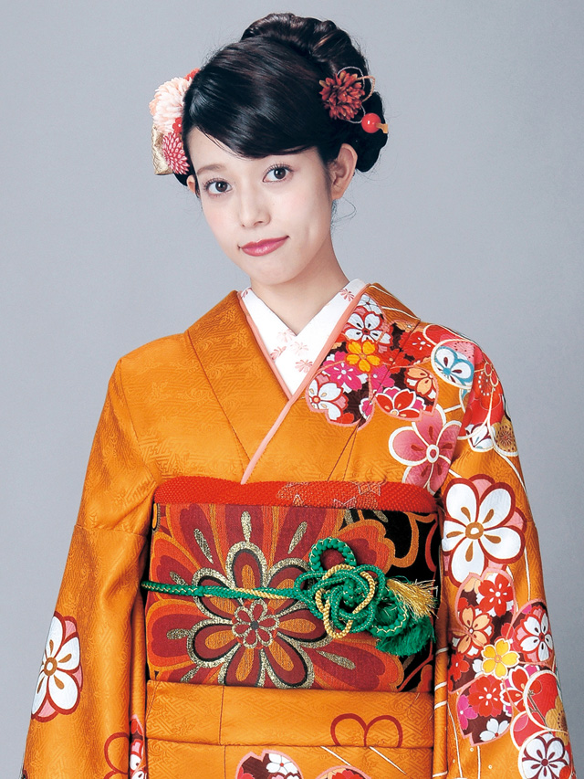ホーム | 成人式の着物(振袖) > 振袖セット振袖 セット 成人式 正月 H・Lブランド 絵羽柄の振袖 袋帯 小物 6点セット【オレンジ系、菊に桜】