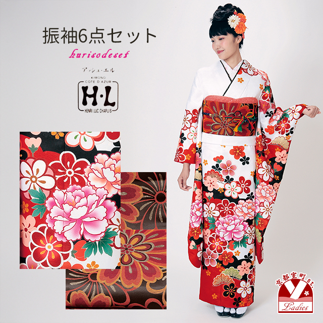 振袖 セット 成人式 正月 H・Lブランド 絵羽柄の振袖 袋帯 小物 6点セット【白×黒赤、牡丹】[HLfuriset-w-07br]