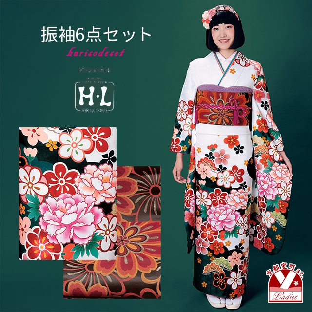振袖 セット 成人式 正月 H・Lブランド 絵羽柄の振袖 袋帯 小物 6点セット【白×黒緑、牡丹】[HLfuriset-w-09br]