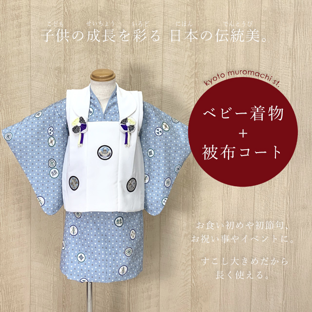 初節句に 男の子 赤ちゃん用 ベビー被布と二部式着物 セット(合繊)【白x水色、鱗】[HFB215]